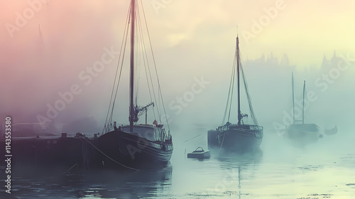 Boats moored in a foggy harbor. Harbor. Illustration
