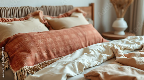 bedchamber, pillow, bedding, interior, decor, home, design, comfort, cosy, texture, linen, rustic, style, aesthetic, natural, cotton, elegant, calm, serene, relaxing, sleep, neutral, tone, room
