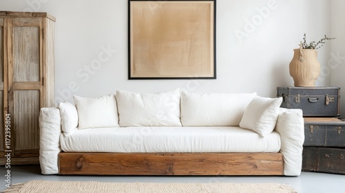 Boho chic interior featuring white sofa, vintage wooden cabinet, rustic suitcase, and art poster in modern farmhouse style décor
