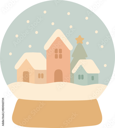 Boho Christmas Snow Globe with Winter Village Houses and Snow. Flat Design Holiday Illustration.