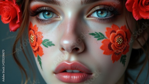 experimental, make-up, bold, floral, rose, red, glistering, gold, glowing, artistic, beauty, closeup, vibrant, striking, delicate, modern, creative, unique, face, dramatic, innovative, portrait, fashion, intricate, decorative, elegant, abstract, bright, cosmetic, style