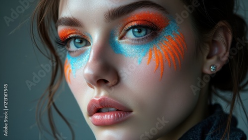 Bold experimental makeup on a woman with vibrant orange and blue accents, emphasizing fashion and creativity.