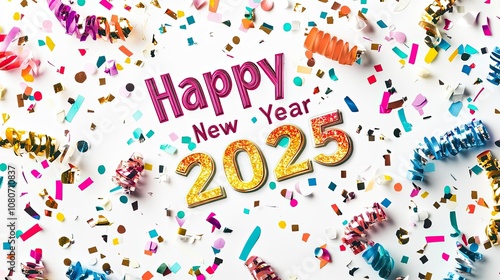 "Bold 'Happy New Year 2025' in modern typeface, surrounded by festive, colorful confetti on a bright white background."