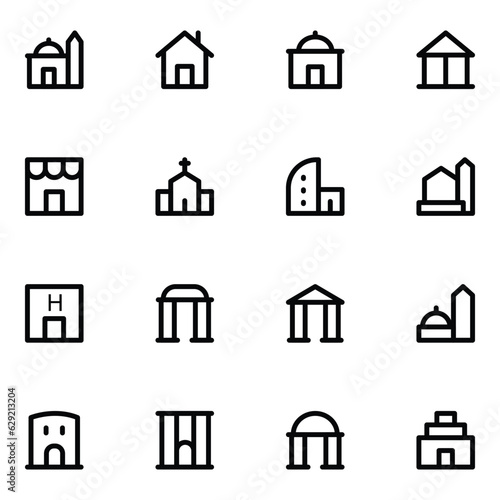 mosque, tomb, hut, home, museum, library, building, bank, hotel, shack, villa, house, filed, factory, mill, shop, store, church, chapels, skyscraper, architecture, skyline, historical building, landmark, castle, temple, construction, icon, vector, linear, outline