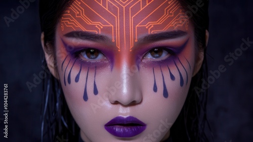 portrait, make-up, bold, metallic, woman, elaborate, fashion, face paint, beauty, futuristic, artistic, colourful, glowing, dramatic, styled, science fiction, conceptual, cosmetic, eye makeup, face art, avant-garde
