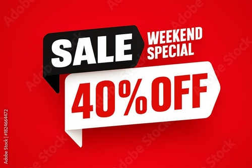 Bold red background with a black sale tag and white 40 percent off weekend special banner