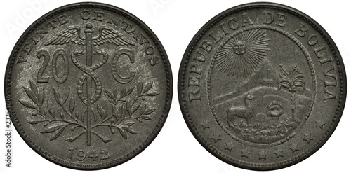 Bolivia Bolivian coin 20 twenty centavos 1942, caduceus divides denomination, olive springs and date below, arms, lama near sheaf, palm tree, hut on hill, sun with rays above mountain behind,