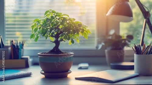 plant, bonsai, tree, desk, office, home, window, sunlight, sun, light, green, leaf, pot, nature, work, study, peaceful, serene, calm, relaxing, quiet, calmness, sharpened, concentration, productivity, creativity, inspiration, growth, miniature, small, design, decor, interior, room, space, healthy, vibrant, fresh, morning, afternoon, evening, day, lifestyle, background, image, photo, picture, scene