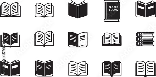 Book Icons Vector Set – Silhouettes of Open, Closed, and Stacked Books for Education and Library Design.
