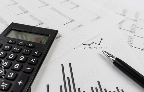 bookkeeping and accounting business concept, calculator and pen on data sheets and printed charts