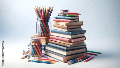 Books stacked with a jar of colorful pencils on top, isolated on white background. Concept of education and learning. 3D Rendering