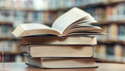 Books World. Closeup of Open Book on Library Bookcase with Blur Background