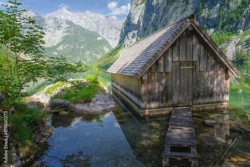 Bootshaus am Obersee lake in Berchtesgaden National Park, Alps Germany