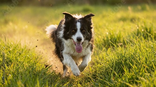 dog, border collie, running, field, grass, sunset, golden hour, active, happy, energetic, pet, animal, domestic, nature, summer, spring, meadow, fast, motion, action, canino, sheepdog, black-and-white, panting, exercise, play, fun, light, sunlight, bokeh, landscape, rural, country, farm, agility, athletic, intelligent, loyal, friends, companion, jumping, sunshine, vitality