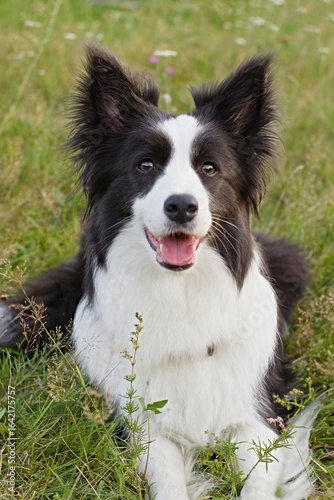 Border Collie dog sitting on meadow with tongue out and ears up, looking at camera in daylight. Ideal for pet care themes, dog breed promotion, and outdoor canine photography references.