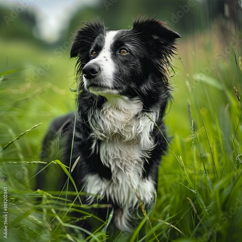 Border Collie dog standing in green grass. Dog on walk.