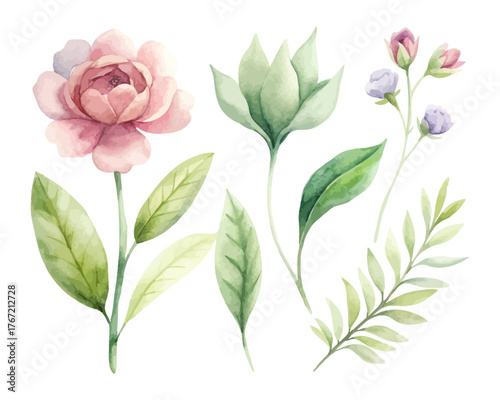 Botanical Watercolor Greenery and Flowers Clipart Set isolated on white background