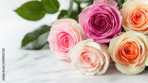 Bouquet of colorful roses on a marble surface.