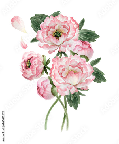 postal, postcard, banner, emblem, art, design, bouquet, floral, flora, peony, arrangement, plant, flower, botanical, card, illustration, blossom, agriculturalist, watercolor, green, isolated, isolated on white, white background, tradition, decoration, decorative, botany, pink, hand-drawn, garden, element