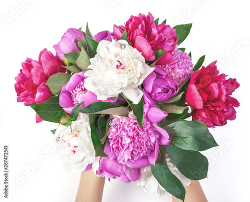 Bouquet of pink and white peony flowers in woman's hand isolated on white background. Top view. Flat lay.