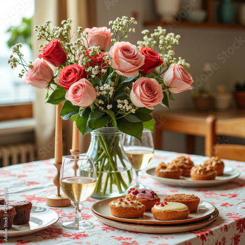 Bouquet of Roses in a Vase on a Table with Snacks — Festive Setting for International Women's Day
