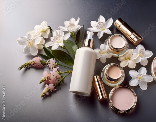 boutique beauty products arranged elegantly with delicate flowers on polished surface
