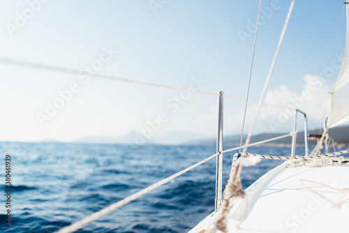 sailboat, sail, blue, board, bow, day, daylight, deck, front, mediterranean, ocean, part, prow, rail, railing, sailing, sea, ship, simple, sky, speed, summer, summer, sunny, surface, transport, travel, vacation, wave, white, wind, yacht, no people
