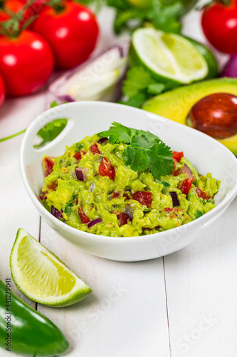 Bowl of Avocado Guacamole Mexican Dip with Avocado, Lime, Tomato, Cilantro with Fresh Ingredients on a Table with Tortilla Chips. Selective focus.