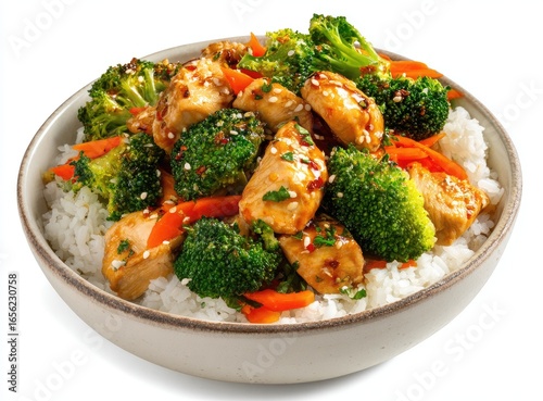 chicken, stir fry, broccoli, rice, vegetable, dish, bowl, food, healthy, meal, protein, orange, asian, cookery, tasty, delicious, alimentary, lunch, dinner, savoury, appetising, cooked, fresh, closeup, pale, white, background, portion, ready, eat, eatery, serving, carrot, seasoned, sesame, sauce, tender, juicy, carb, comfort, balanced, light, bright