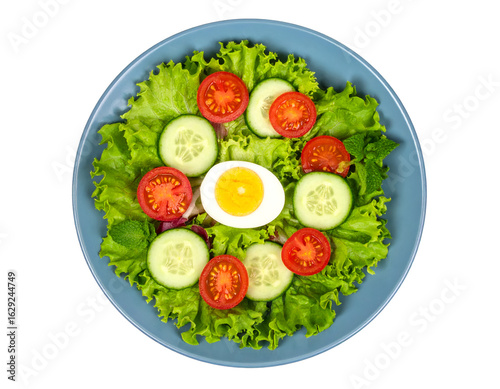 Bowl of fresh salad with lettuce, tomato, cucumber and boiled egg, viewed from top, ideal for diet and nutrition design. Generative AI