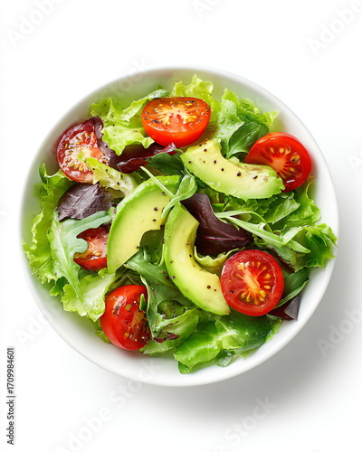 bowl of healthy salad with avocado, greens, cherry tomatoes, isolated on white background