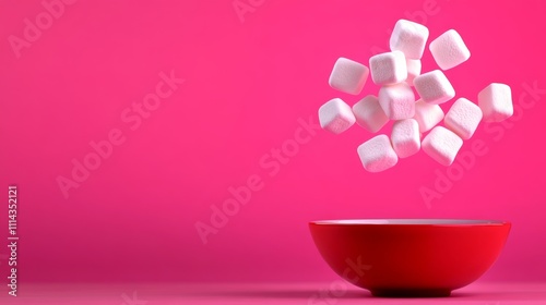Bowl of sugar cubes is flying through the air. The bowl is red and the sugar cubes are white. The image has a playful and whimsical mood