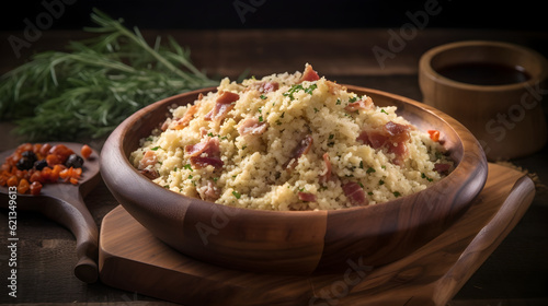 Bowl with Brazilian farofa. Made with manioc flour. Generative AI