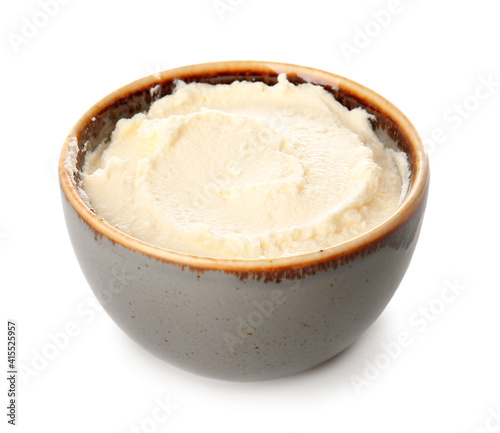 Bowl with tasty cream cheese on white background