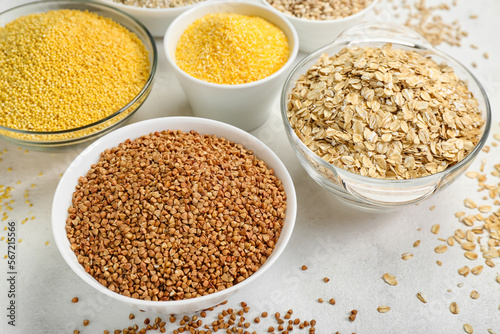 Bowls of different cereals on light background, closeup