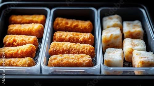 Box of frozen fish sticks in a home freezer, Frozen seafood snacks, Easy meal preparation