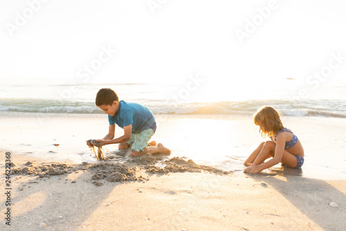 boy, girl, children, elementary, caucasian, sibling, sister, brother, dig, play, ocean, beach, shore, sand, hole, swimwear, day, outdoors, pair, 2, people, lifestyle, tide