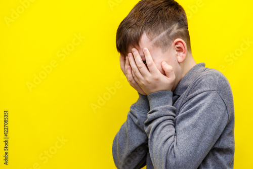 boy, teenage, young, children, beautiful, cute, alone, standing, background, yellow, caucasian, european, fashionable, crying, emotion, sad, grief, lamp, jacket, grey, coiffure, lightning