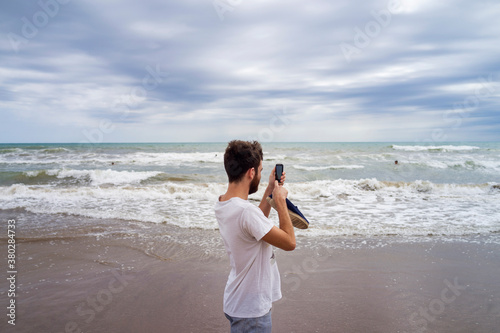 beauty, beach, smartphone, young, wave, tech, summer, storm, sky, shore, shoe, sea, photographer, photo, phone, man, horizontal, horizon, colours, cloudy, cloud, centered, boy, blur, caucasian, white, male, person, people, adult, adult, 20s, grown-up