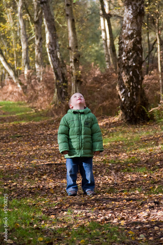 toddler, little boy, forest, children, children, youth, wood, tree, autumn, fall, leaf, bark, looking up, nature, green, male, jean, coat, wonder