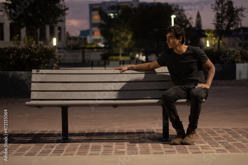 boy sitting sideways at night on a bench relaxed looking sideways to the left wearing black clothes
