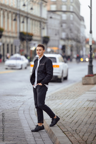 Boy walking on the street an look at camera
