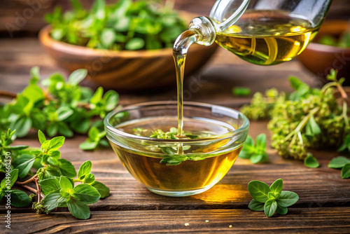 Brahmi oil being poured into a small bowl, with herbs arranged around