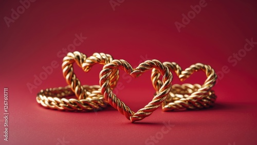 Braided golden hearts on a rich red background symbolizing love and joy, perfect for Valentine's Day themed designs and greetings.