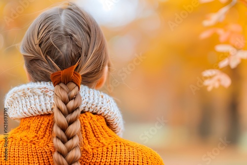 Braided ponytail, cozy autumn fashion, knitted scarf, fall season, outdoor portrait, vibrant orange color, back view, warm mood.