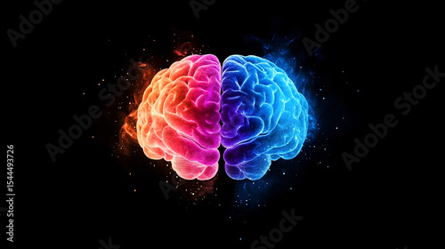 brain, mind, intelligence, thought, concept, creative, logic, thinking, imagination, science, anatomy, neuroscience, cognition, idea, innovation, learning, memory, nerve cell, consciousness, cognition, abstract, artistic, colourful, glowing, energy, black background, bright, vibrant, illustration, digital artwork, human, cleaving, half, contrasting, red, blue, orange, purple, light, particle, cosmos, universe, potential, wisdom, sharpened, clarity, mental health