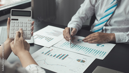 Brainstorm team, Marketers and financial accountants are discussing and analyzing charts to plan strategies to meet customer needs, Business data graph, Team meetings or business consulting.