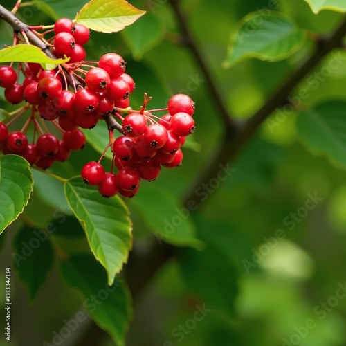 Branch covered in bright red autumn berries against a lush green background, tree leaves,
