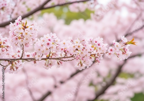 Branch of cherry blossoms, light pink petals, with blurred background creating soft, springtime mood