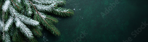 Branch of snowy green spruce, Christmas tree on green background. Winter template, banner for Christmas, New Year and sale season. Web card and backdrop with space for text